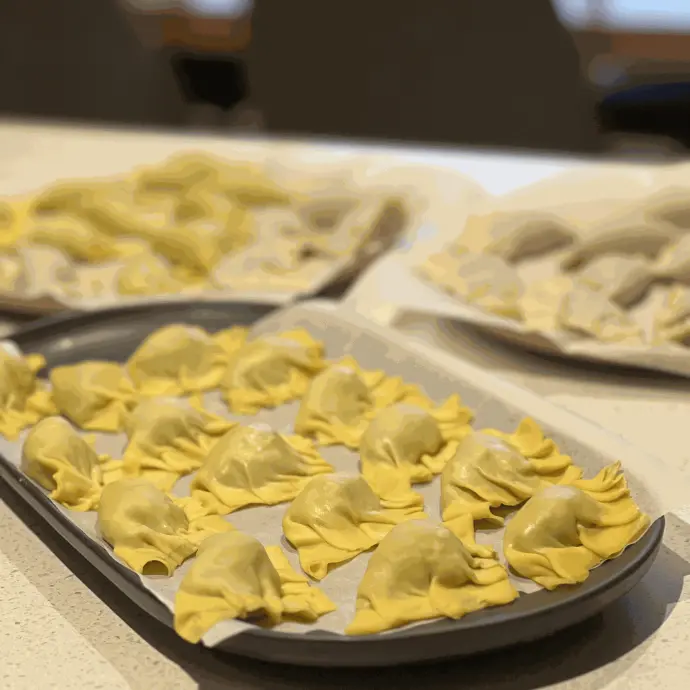 4. Create pleats along the edges: I typically begin at the centre, making three pleats on one side of the dumpling, followed by three on the opposite side. While forming the pleats, ensure the dumpling is resting on your work surface so it remains flat. This flat base is essential for achieving a crispy bottom on your potsticker. Once completed, place each dumpling on a baking sheet lined with parchment paper or a sprinkle of semolina flour or cornmeal.