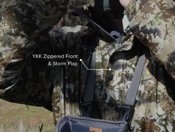 Stay dry and comfortable in the Spika Valley Waterproof Jacket. A functional jacket for the everyday hunter utilising Hydroshield weatherproof membrane and DWR treatment to create the ultimate barrier. Featuring a full length YKK zip and storm flap, peaked hood, front pockets and elastic cuffs to provide protection from harsh elements. Durable yet quiet microfuse outer fabric allows stealthy movement while stalking and being active.